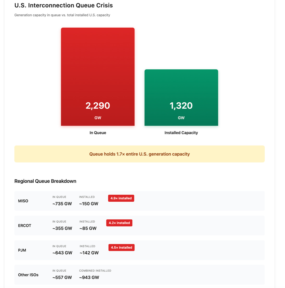 The grid can’t keep up. The scale of the bottleneck defies comprehension: interconnection queues across U.S. grid operators now hold approximately 2,290 GW of generation and storage projects awaiting connection—nearly twice the entire installed capacity of the U.S. power plant fleet at 1,320 GW.[^JORDAN] In MISO, queued capacity is 4.9 times installed capacity. In ERCOT, it’s 4.2 times. In PJM, 643 GW waits in queue against just 142 GW of installed capacity.[^JORDAN]